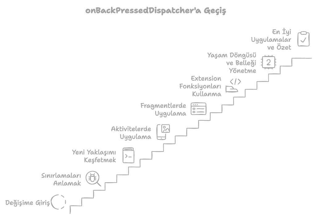 Neyse ki, Android ekibi bu sorunları çözmek adına OnBackPressedDispatcher’ı tanıttı. Bu yeni yapı, geri tuşu yönetimini daha esnek ve sürdürülebilir hale getiriyor. Bu yazıda, OnBackPressed fonksiyonunun neden kullanımdan kaldırıldığını, yerine gelen OnBackPressedDispatcher’ın nasıl kullanılacağını ve Kotlin’in güçlü özelliklerinden extension fonksiyonlar yardımıyla bu yeni yaklaşımı nasıl daha etkili hale getirebileceğimizi detaylı bir şekilde ele alacağız.